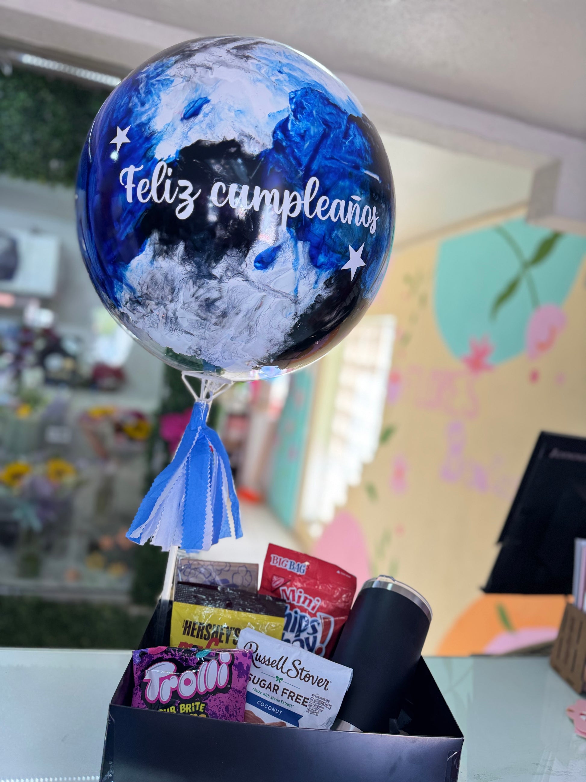 Caja 30cm con botanas, globo burbuja personalizado y termo acero