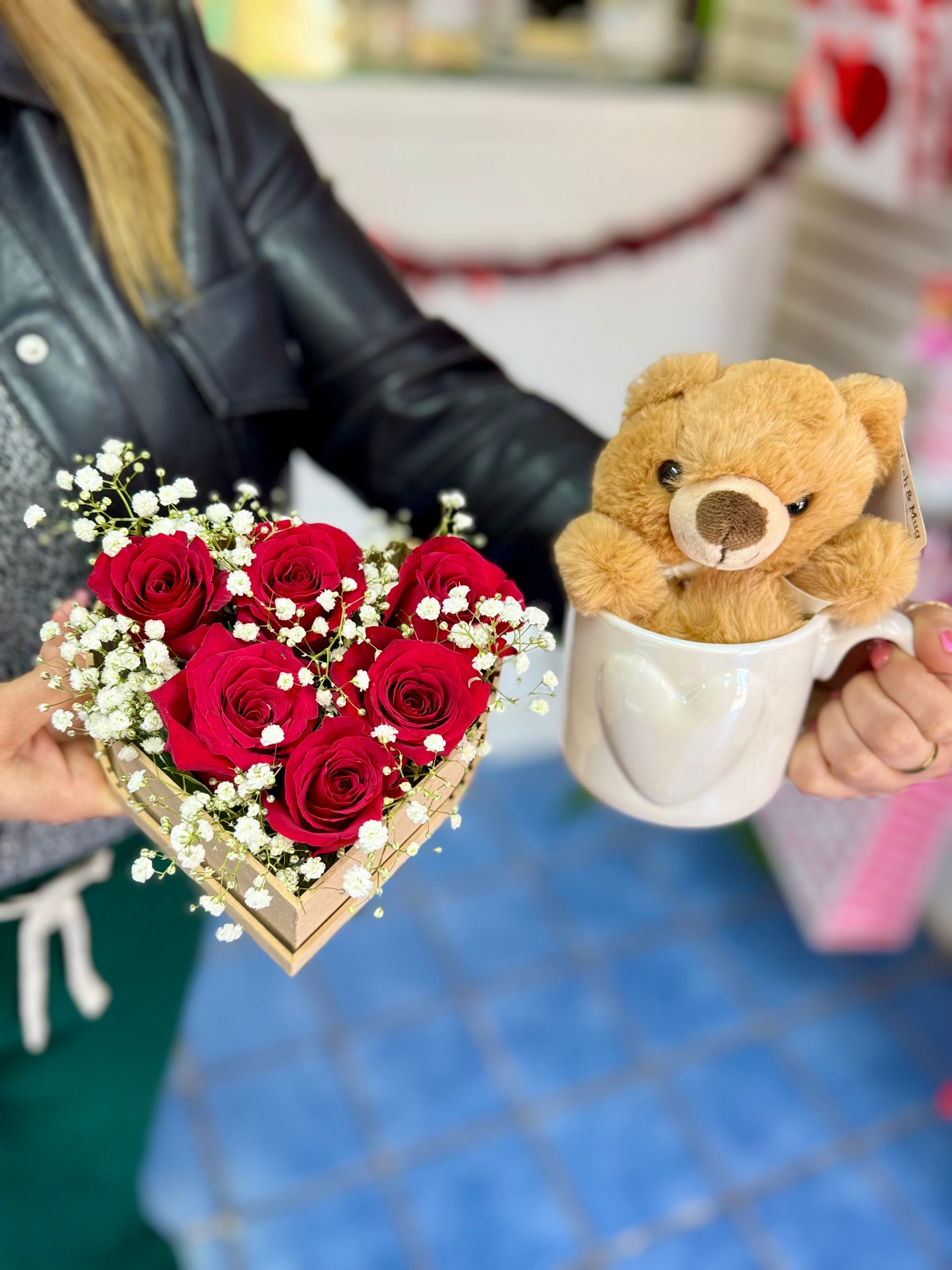 corazon madera con 6 rosas y follaje, incluye taza cerámica con osito.