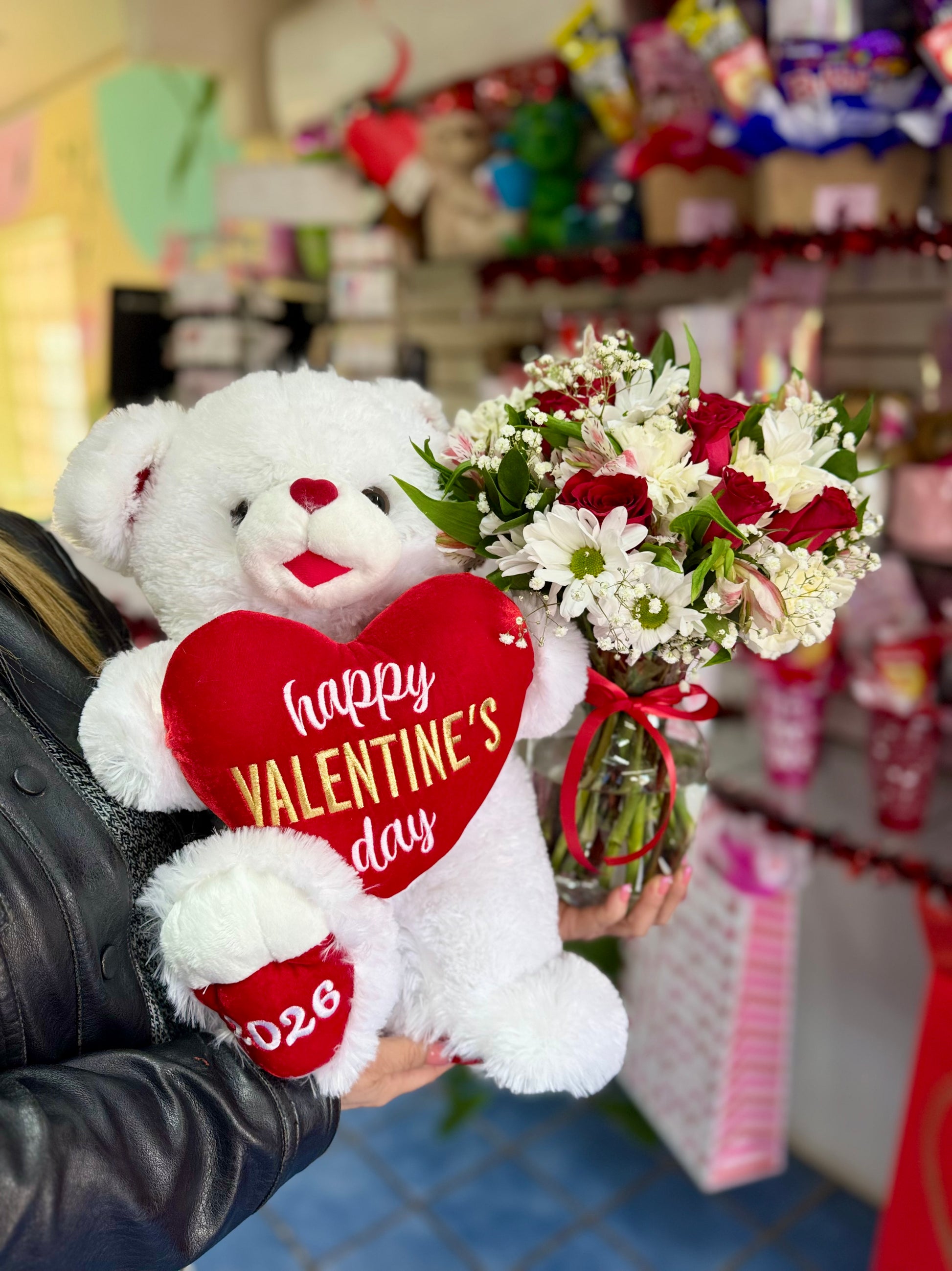 florero 8 rosas, clavel, margarita, diversos follajes, incluye oso peluche mediano edición 2026