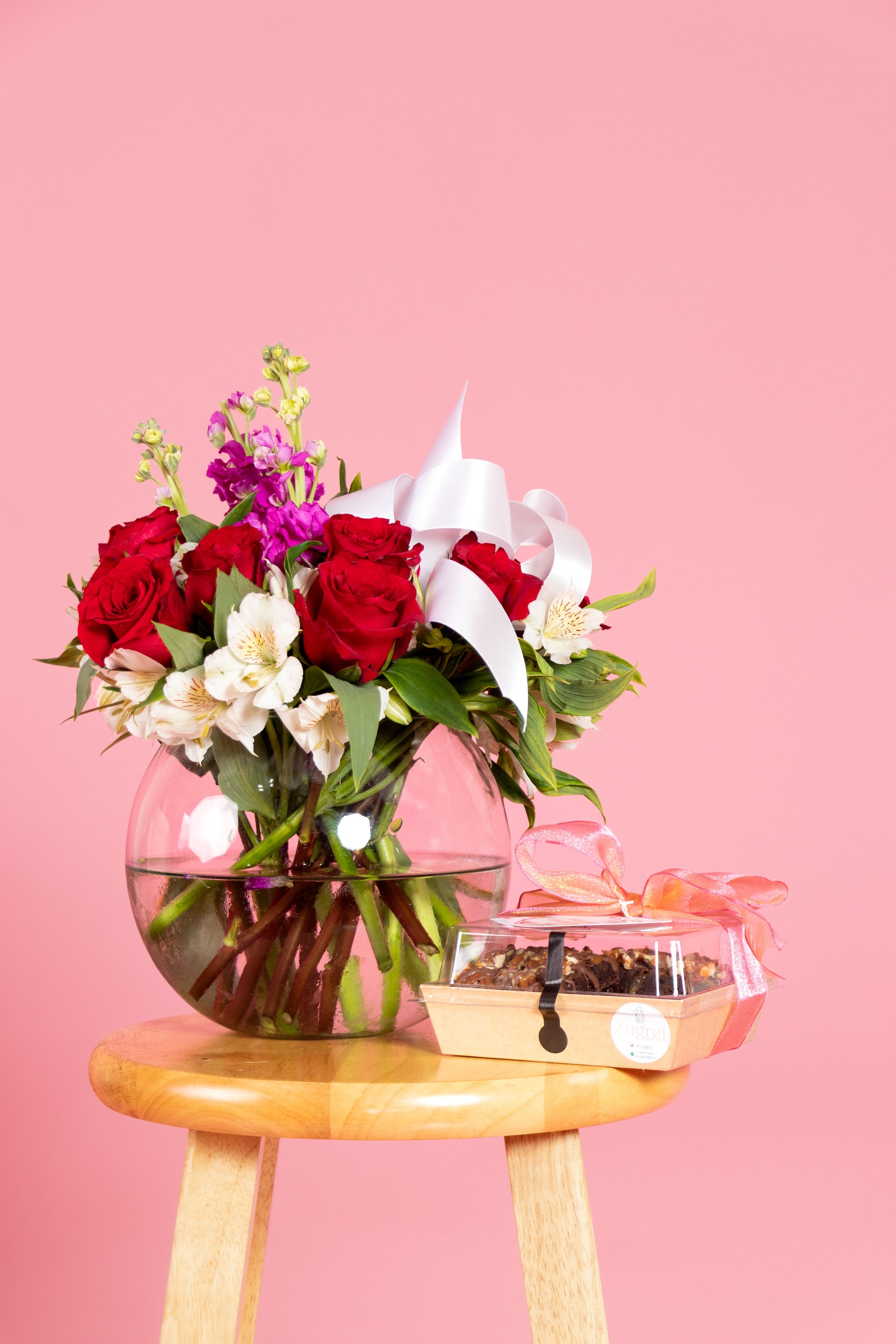 pecera con 12 rosas y diversos follajes, incluye caja 4pzs brownies