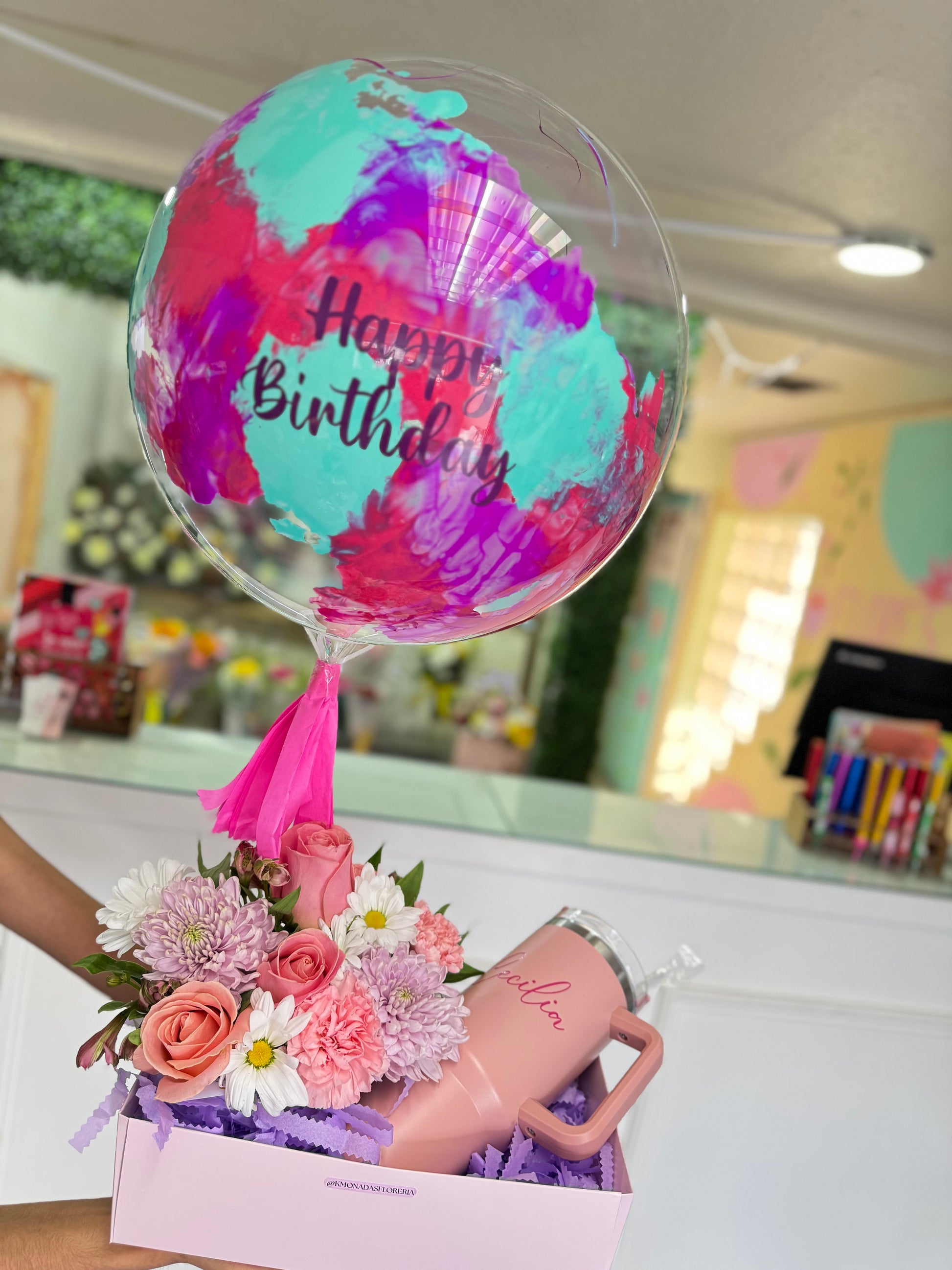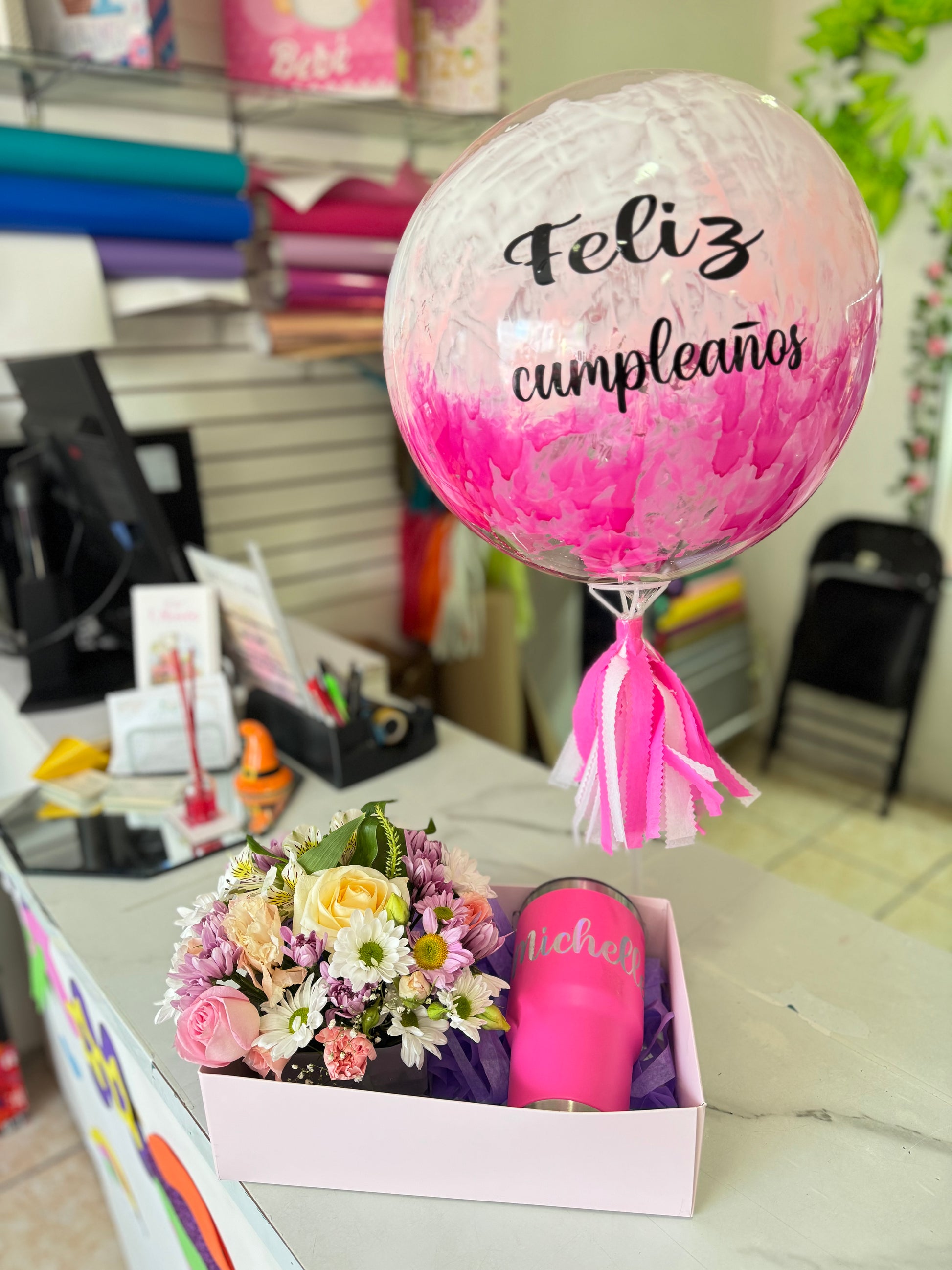 vaso acero, globo personalizado (sin helio), arreglo floral en su caja decorada