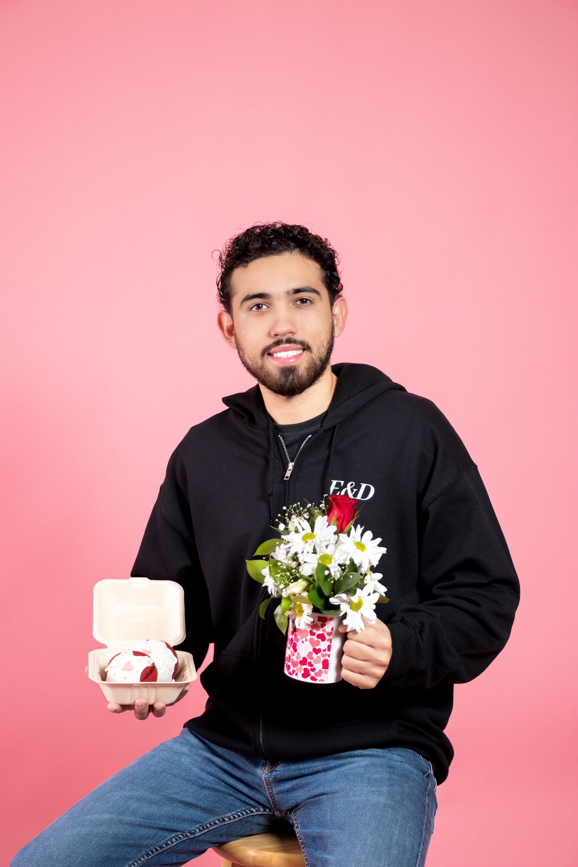 taza cerámica con rosa y margaritas, incluye caja 2pzs de galletas red velvet