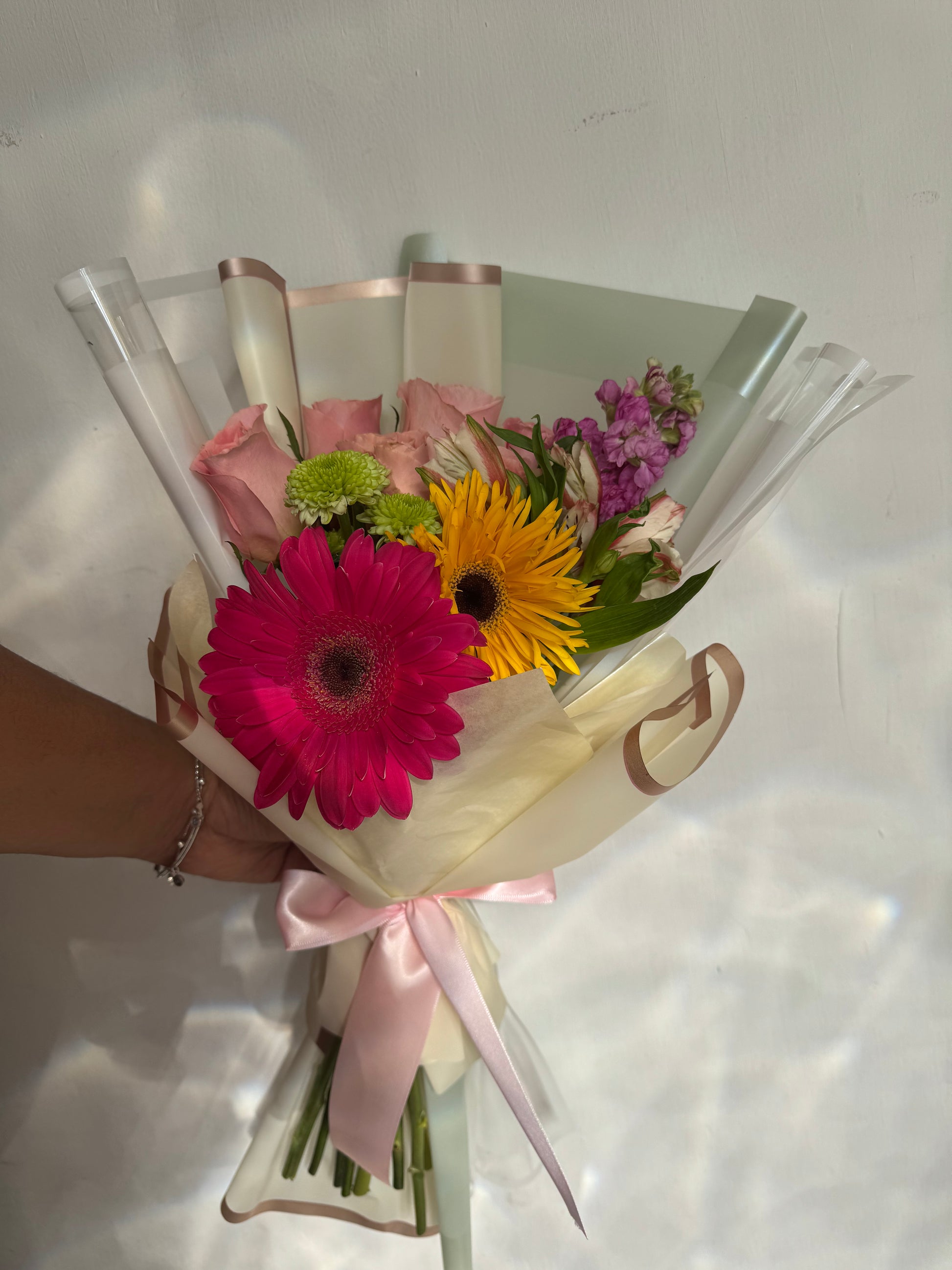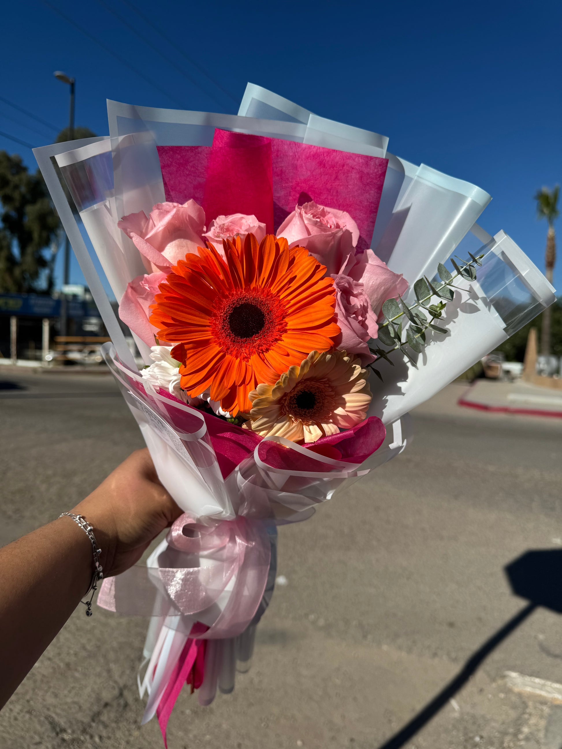 Ramo tamaño mediano con gerberas, margaritas, rosas y diversos follajes