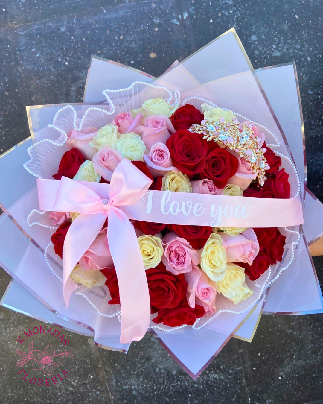 Ramo 50 rosas sin follaje con listón, corona grande y malla alrededor