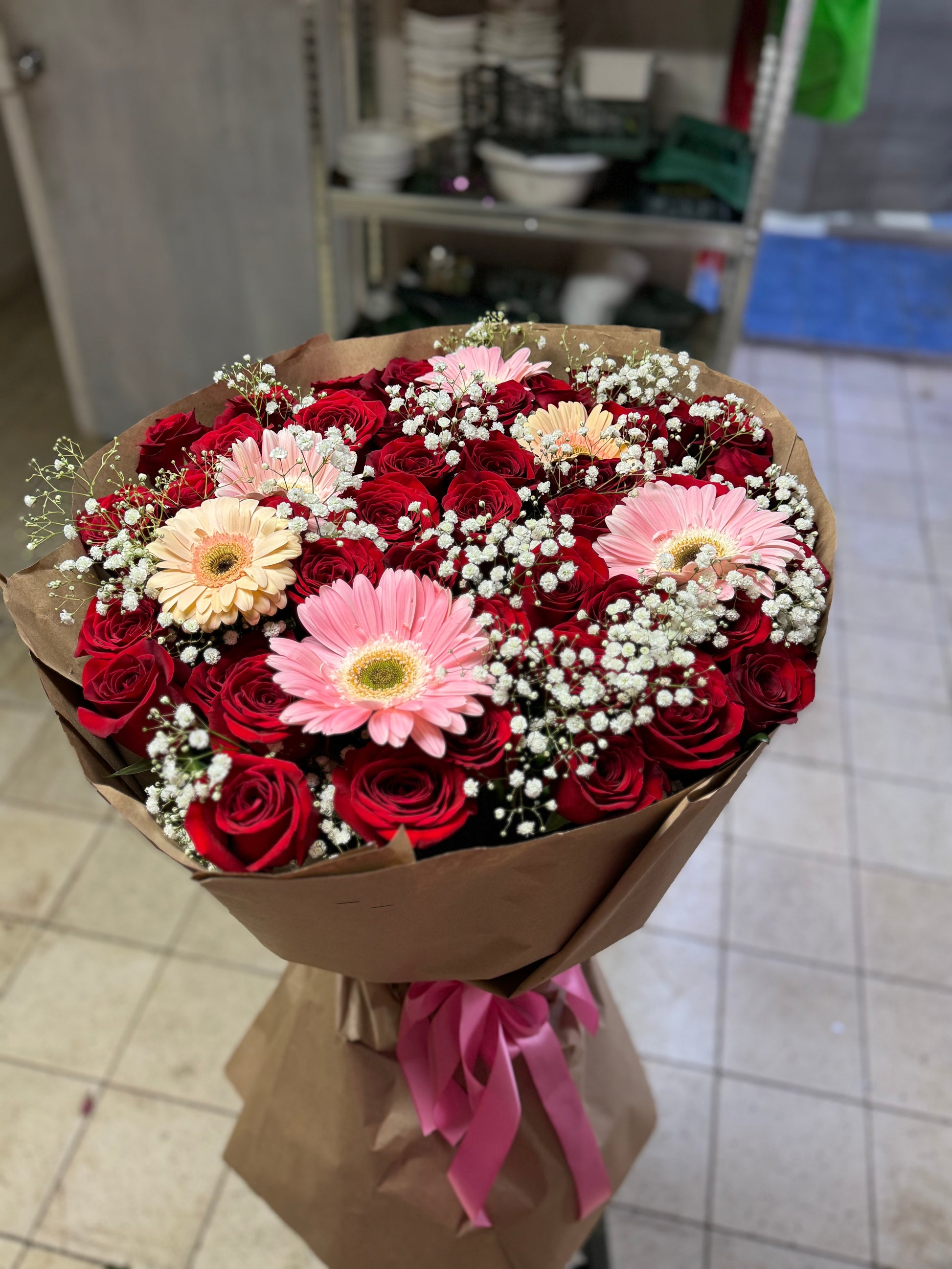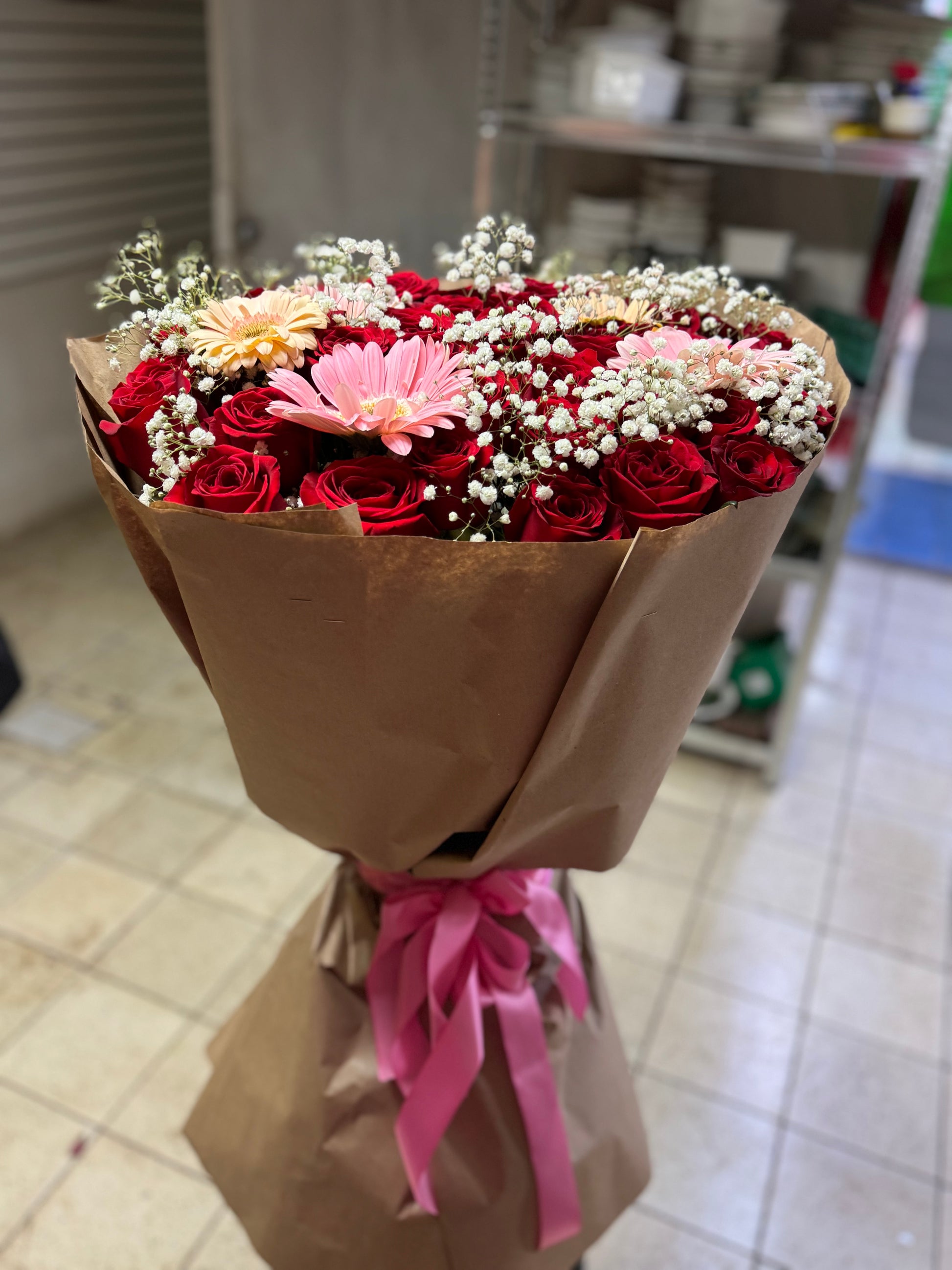 arreglo 50 rosas con guerreras y diversos follajes