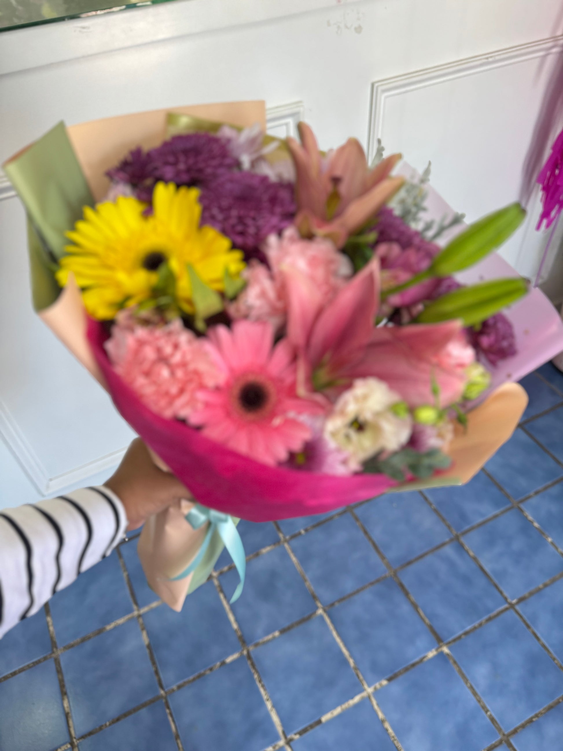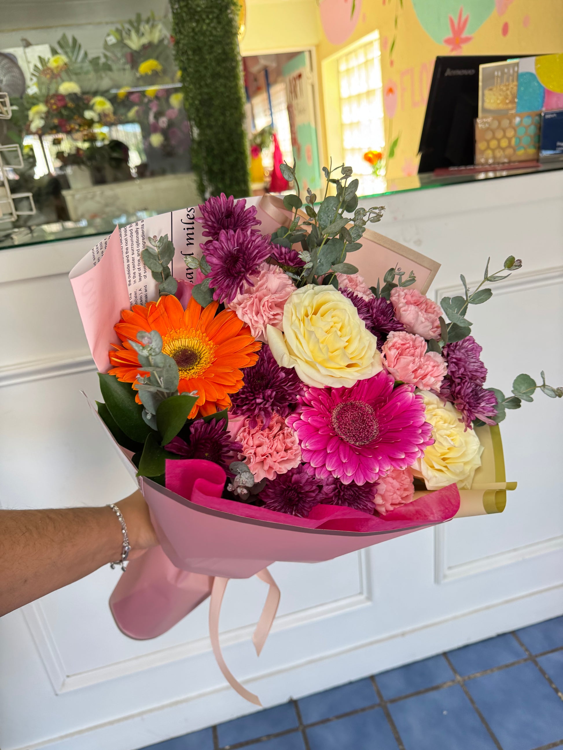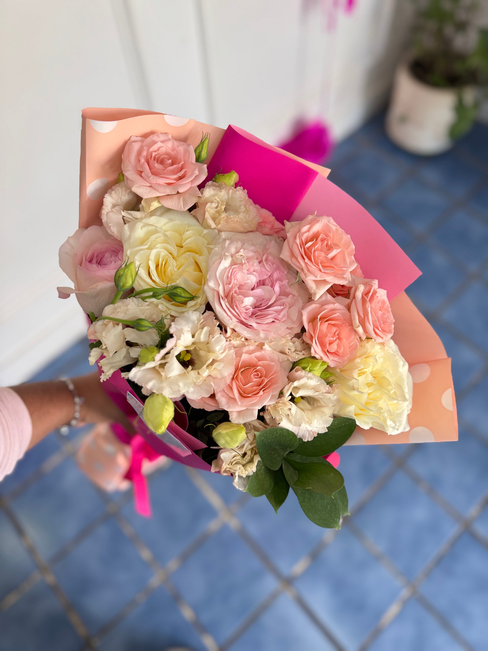 Ramo con rosas, mini rosas, lisianthus, en base con agua